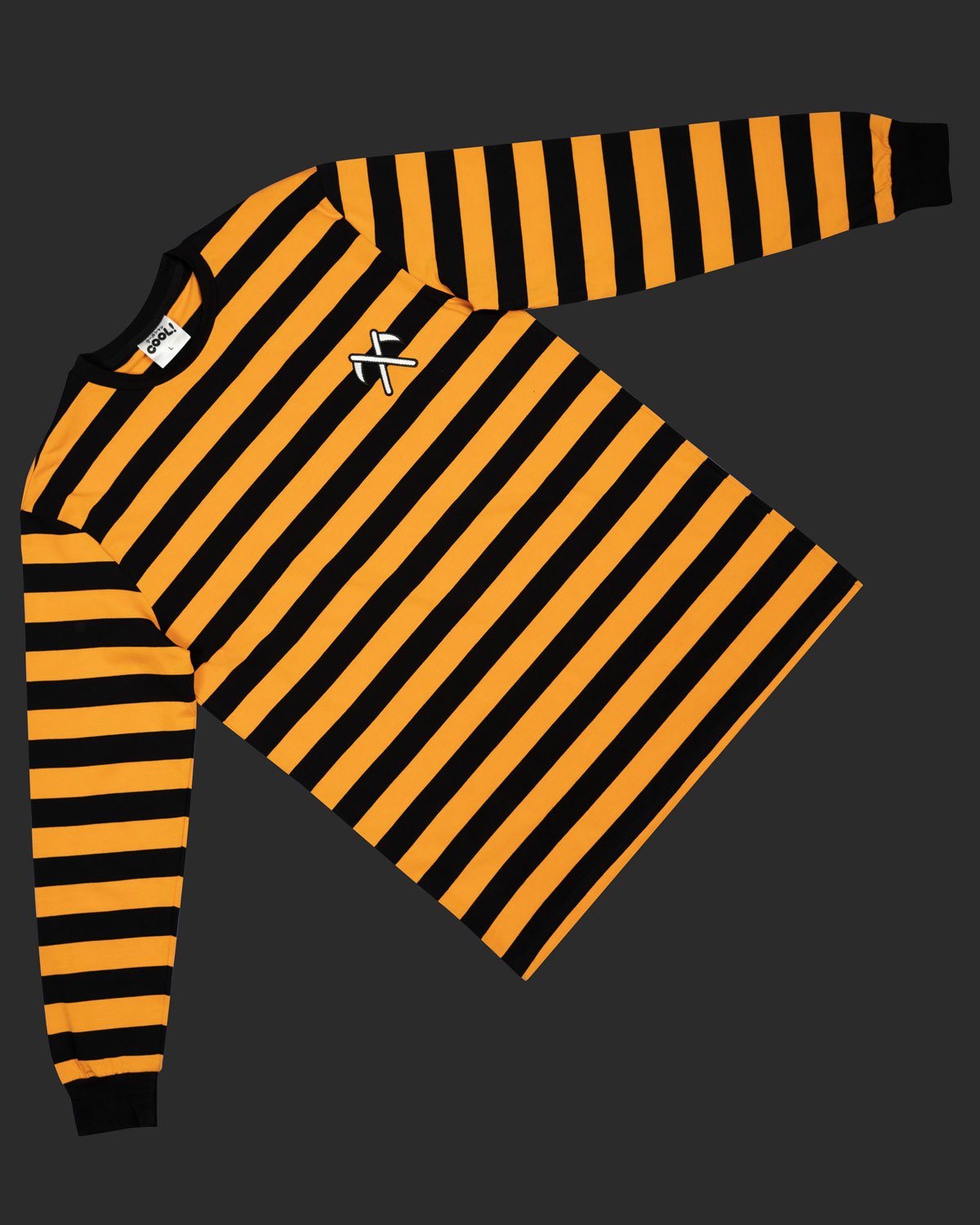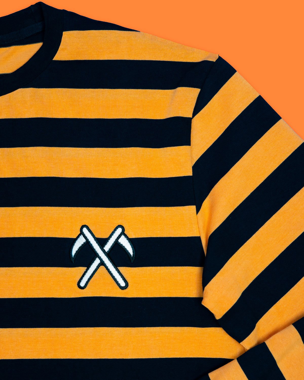CUSTOM STRIPE FABRIC WITH EMBROIDERED SCYTHES ON CHEST