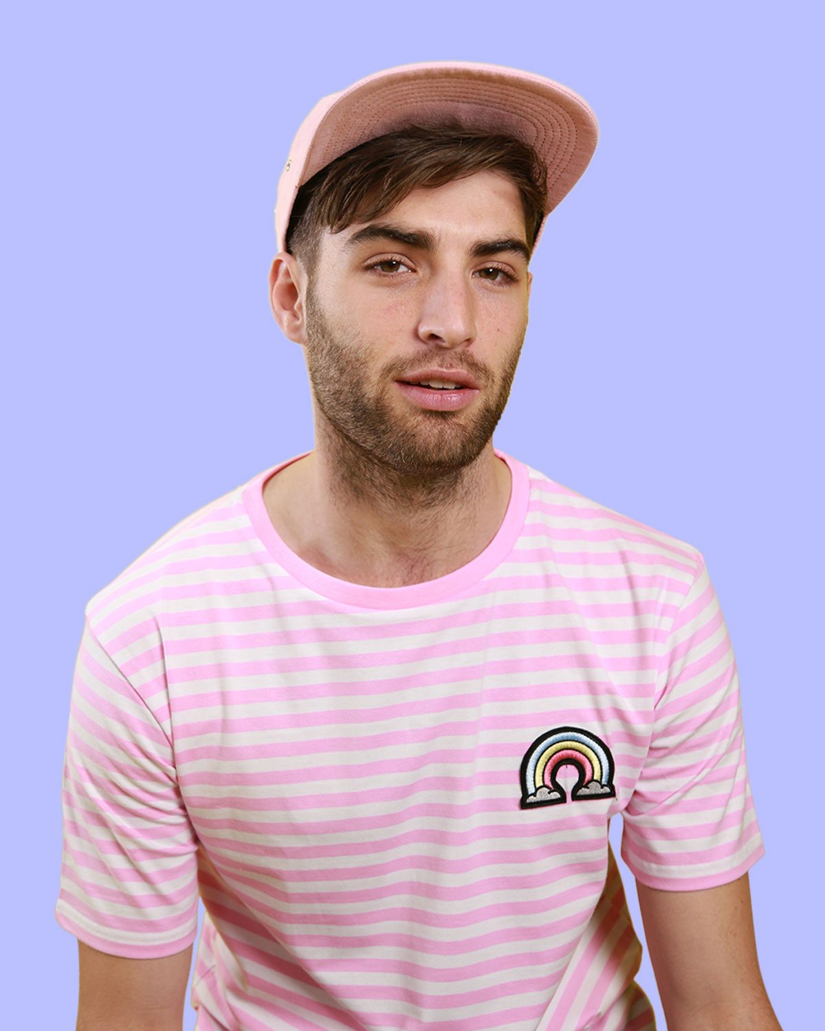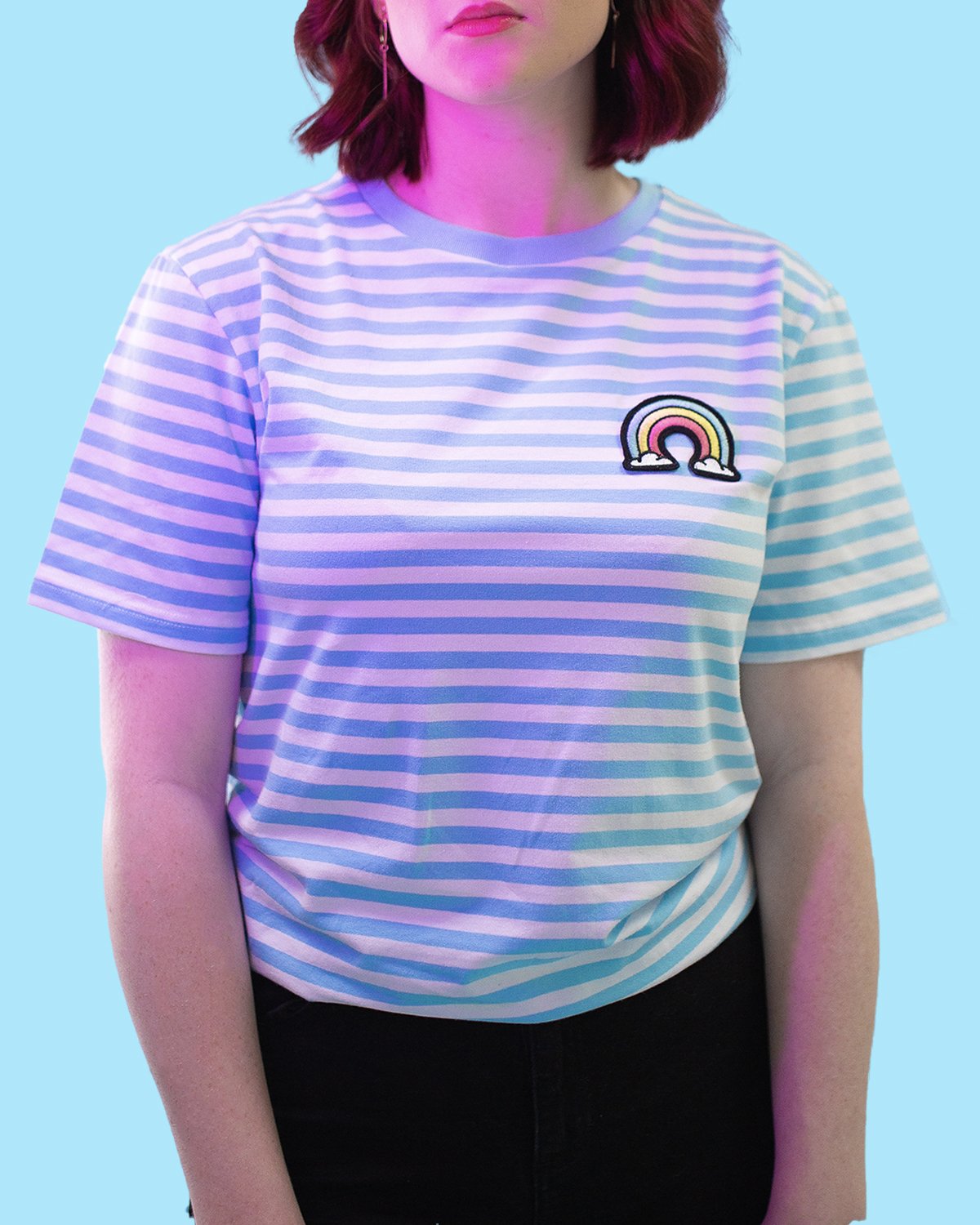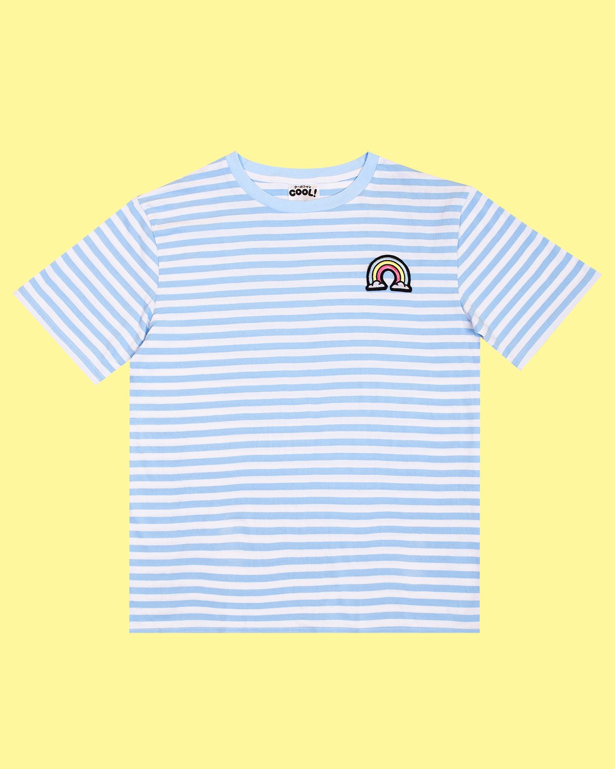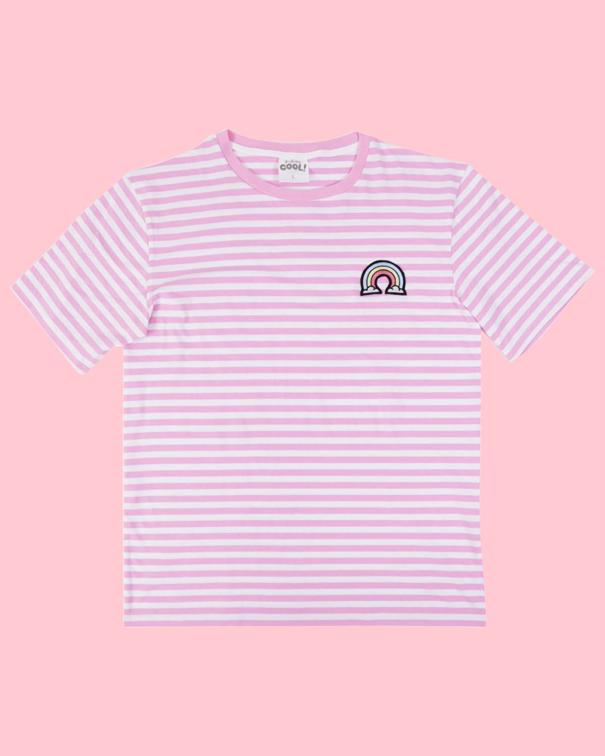 - STRIPED TEE FEATURING A WOVEN RAINBOW BADGE